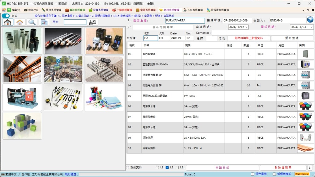 Setelah membuat permintaan pembelian baru, pilih jenis dan spesifikasi material di kotak tampilan sebelah kiri. Masukkan jumlah yang diinginkan di bagian bawah dan tambahkan.